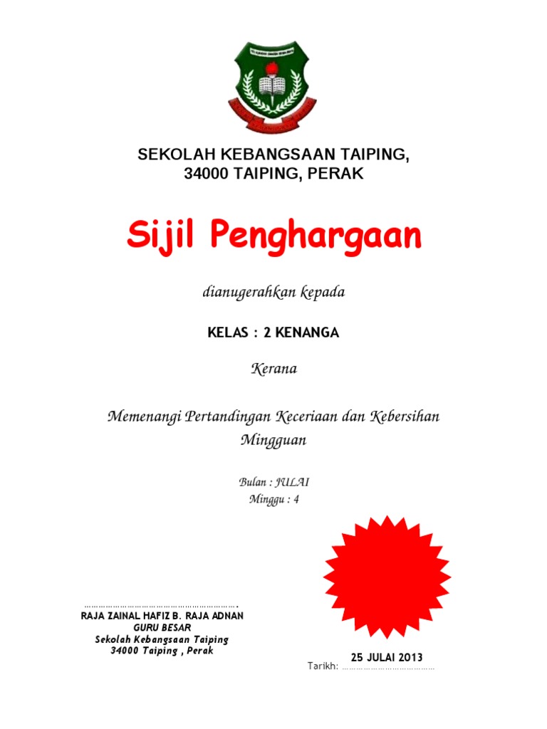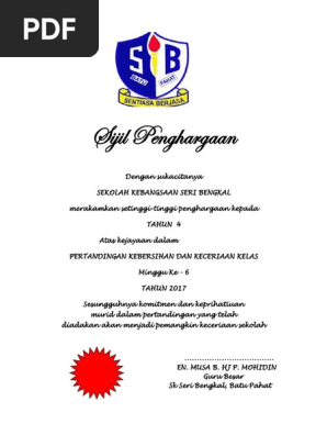 Contoh Sijil Penghargaan Kelas Bersih Tahap 1 Pdf