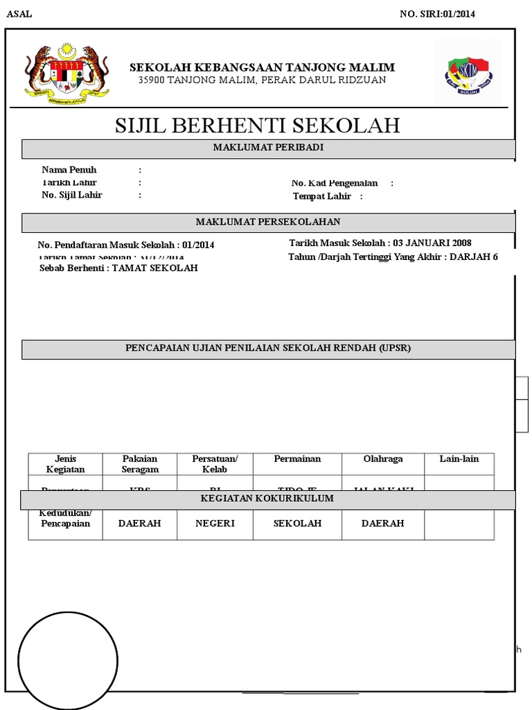 Sijil ini selalunya diberikan kepada murid yang telah berhenti sekolah dan kebanyakan sekolah telah ada sijil kosong yang perlu di cetak diatasnya.